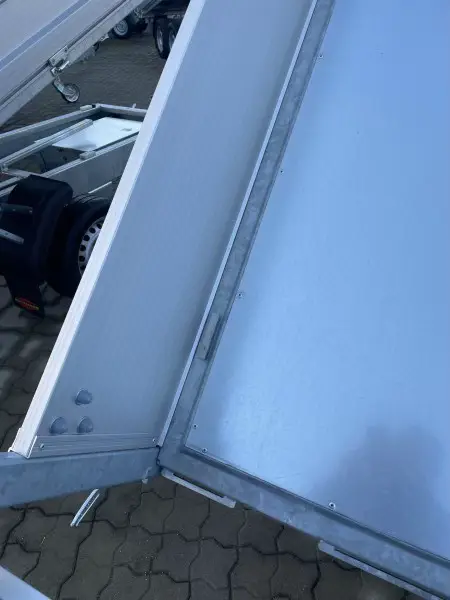 Die stabilen Aluminium-Bordwände mit Winkelhebelverschlüssen sind langlebig und einfach zu bedienen. Der verzinkte Stahlblechboden bietet eine hohe Belastbarkeit und ist optimal für den Transport von Schüttgut, Maschinen und Baumaterialien geeignet.