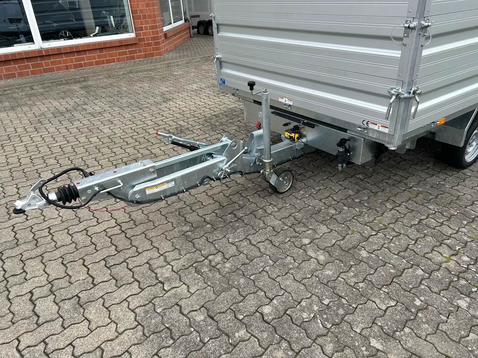 Das Hochlader-Fahrgestell mit untergebauten Rädern ermöglicht eine vollständig nutzbare Ladefläche – ideal, wenn sperrige Materialien oder Paletten transportiert werden müssen. Die Kombination aus robustem Rahmen und Gummifederachsen sorgt für Stabilität und reduziert gleichzeitig Vibrationen während der Fahrt.